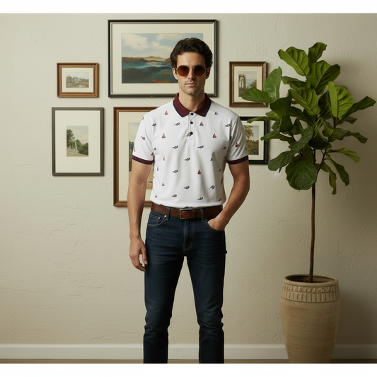 Men’s White Printed Polo Shirt with Maroon Collar